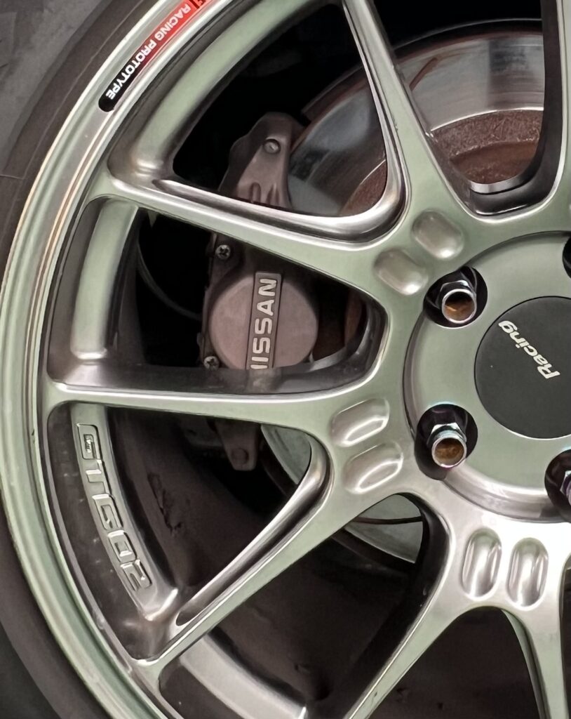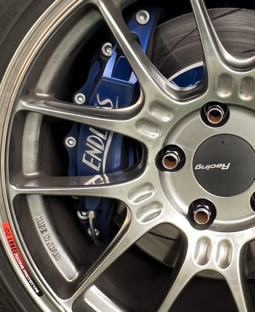 フロントブレーキのキャリパーは、ENDLESS 6pot、ドリフト走行を可能にするためローターサイズ324Φにし17インチをチョイス。アームにはnismo、テンションロットはCUSCOのピロテンション、タイロットについてはGP SPORTSで若干切れ角をアップし、深いドリフトアングルでのコントロールが容易なセッティングとしている。