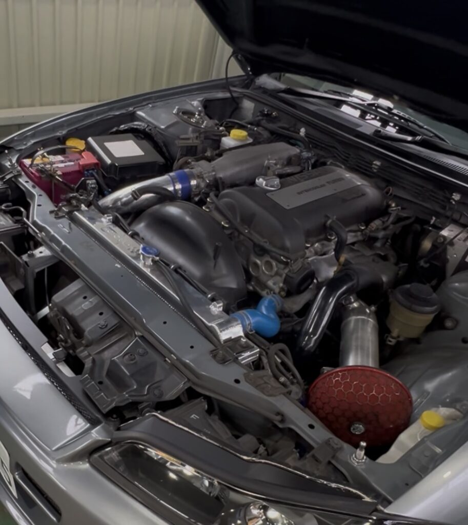 パワーユニットは、タービン及びカム交換の仕様。タービンはTRUSTのT518Z、カムがHKSステップ 1、各システムに合わせインジェクターを750cc×4で燃料を増量、ポンプはnismoをチョイス。パワーアップに合わせラジエターを大型化にした他、オイルクーラーとBLITZの前置きインタークラーをセッティング。最高出力は、シャシーダイナモメーターの計測では、ブースト1.2kで376psとなっている。前後にGP SPORTSの牽引フックを装備。
